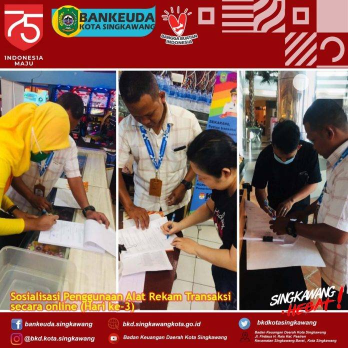 Agenda Hari ke-3, 𝗦𝗼𝘀𝗶𝗮𝗹𝗶𝘀𝗮𝘀𝗶 𝗱𝗮𝗻 𝗣𝗲𝗺𝗲𝗹𝗶𝗵𝗮𝗿𝗮𝗮𝗻 𝗔𝗹𝗮𝘁 𝗥𝗲𝗸𝗮𝗺 𝗧𝗿𝗮𝗻𝘀𝗮𝗸𝘀𝗶 𝘀𝗲𝗰𝗮𝗿𝗮 𝗢𝗻𝗹𝗶𝗻𝗲 dilaksanakan BKD Kota Singkawang melalui Bidang Pajak & Retribusi, berupa pemasangan Roll up banner di lokasi Objek Pajak.