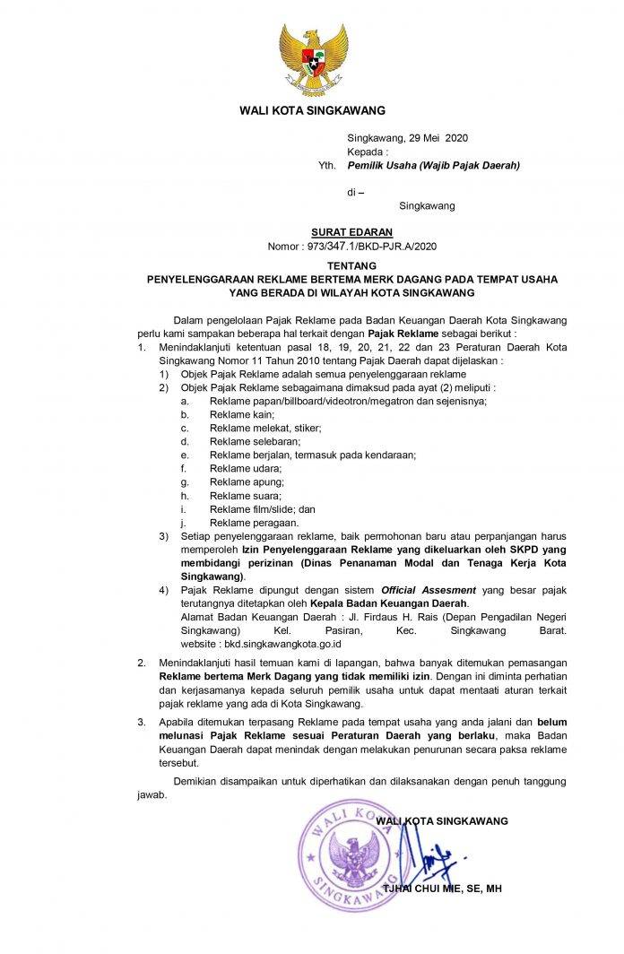 BeritaGaleri SURAT EDARAN WALIKOTA NOMOR : 973/347.1/BKD-PJR.A/2020 TENTANG PENYELENGGARAAN REKLAME BERTEMA MERK DAGANG PADA TEMPAT USAHA YANG BERADA DI WILAYAH KOTA SINGKAWANG Penulis Pajak dan Retribusi - 15 Juli 2020 0 326 SE Walikota ttg Reklame fixUnduh